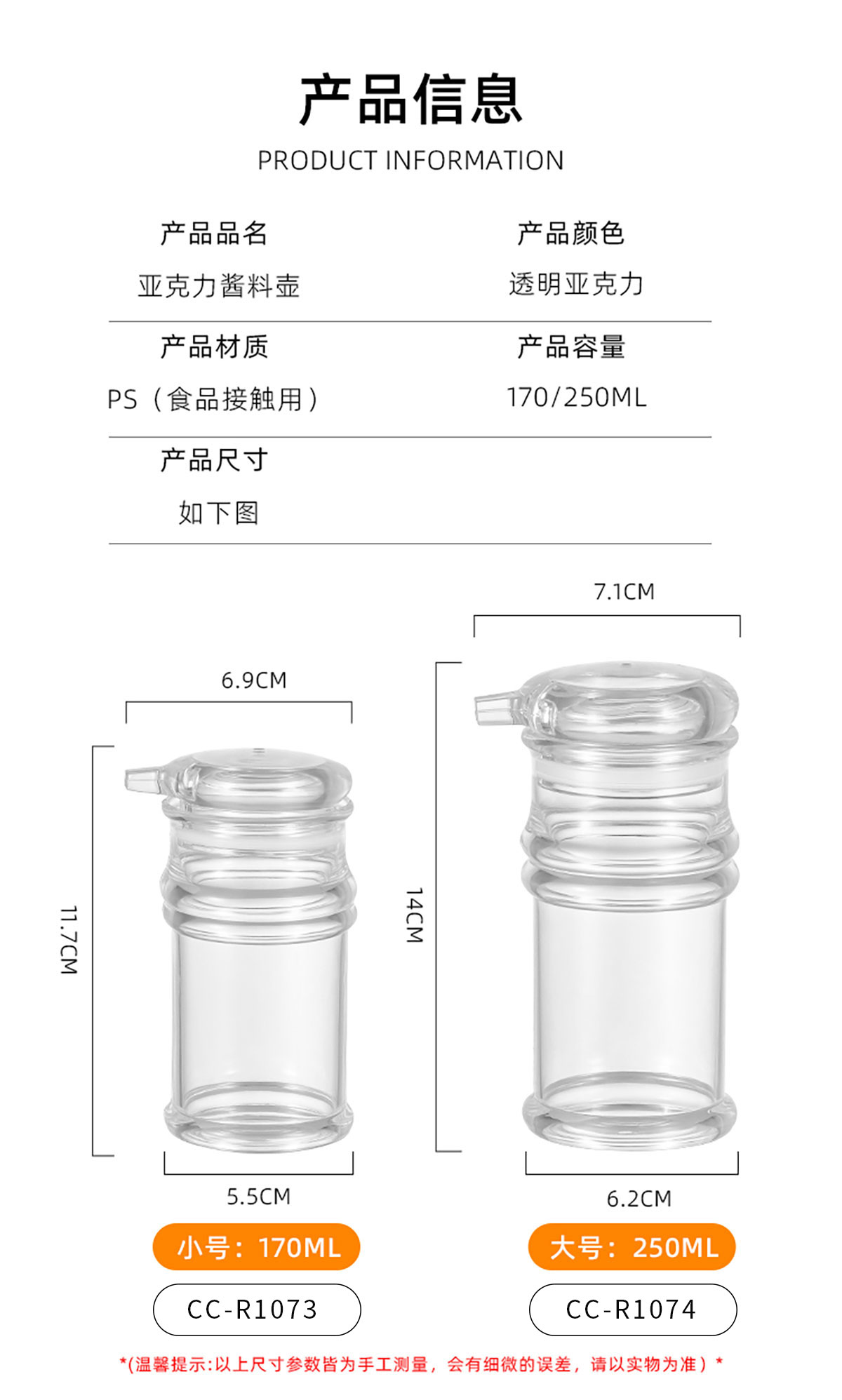 Size: CC-R1073:69*55*117mm/170ml CC-R1074:71*62*140mm/250ml