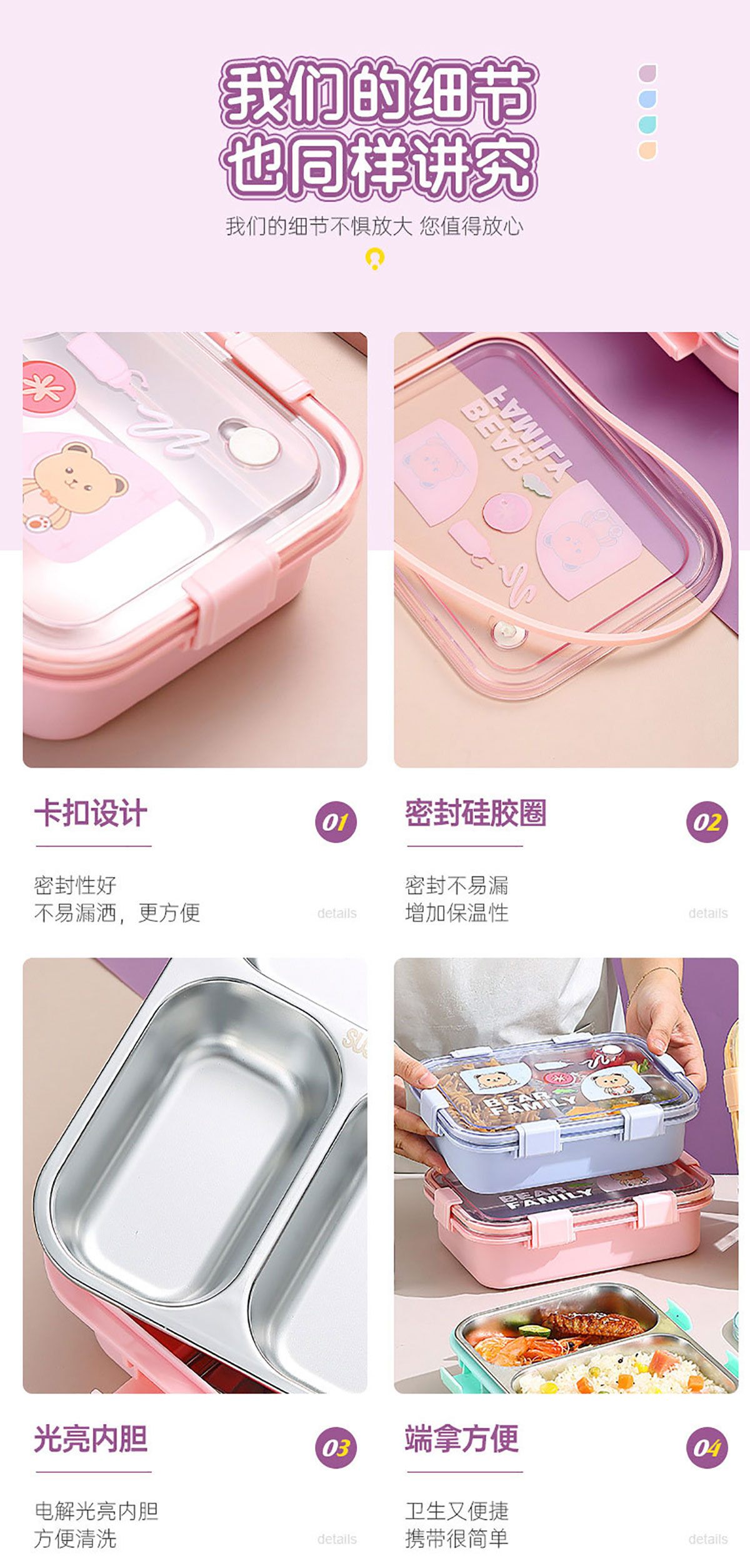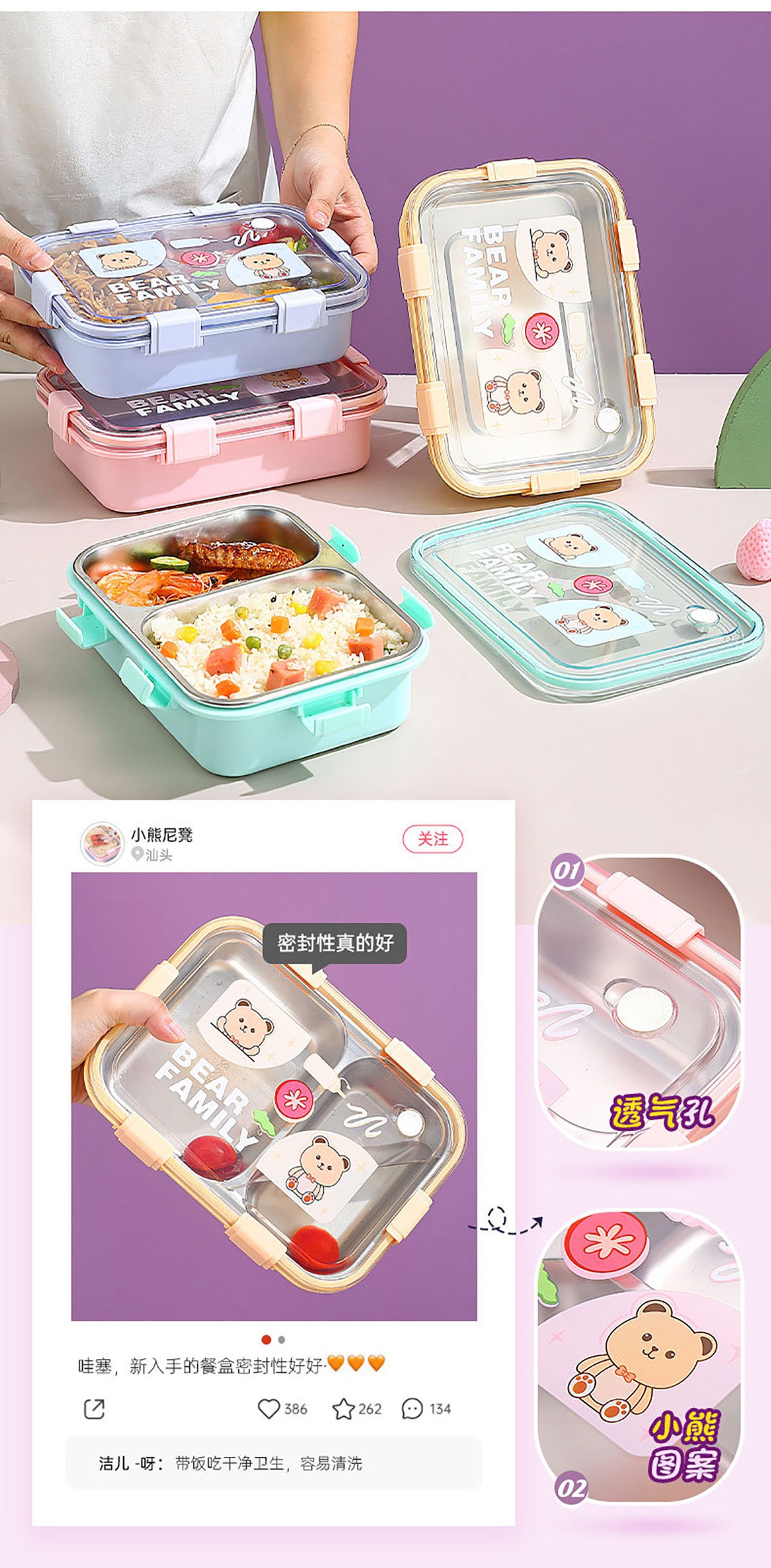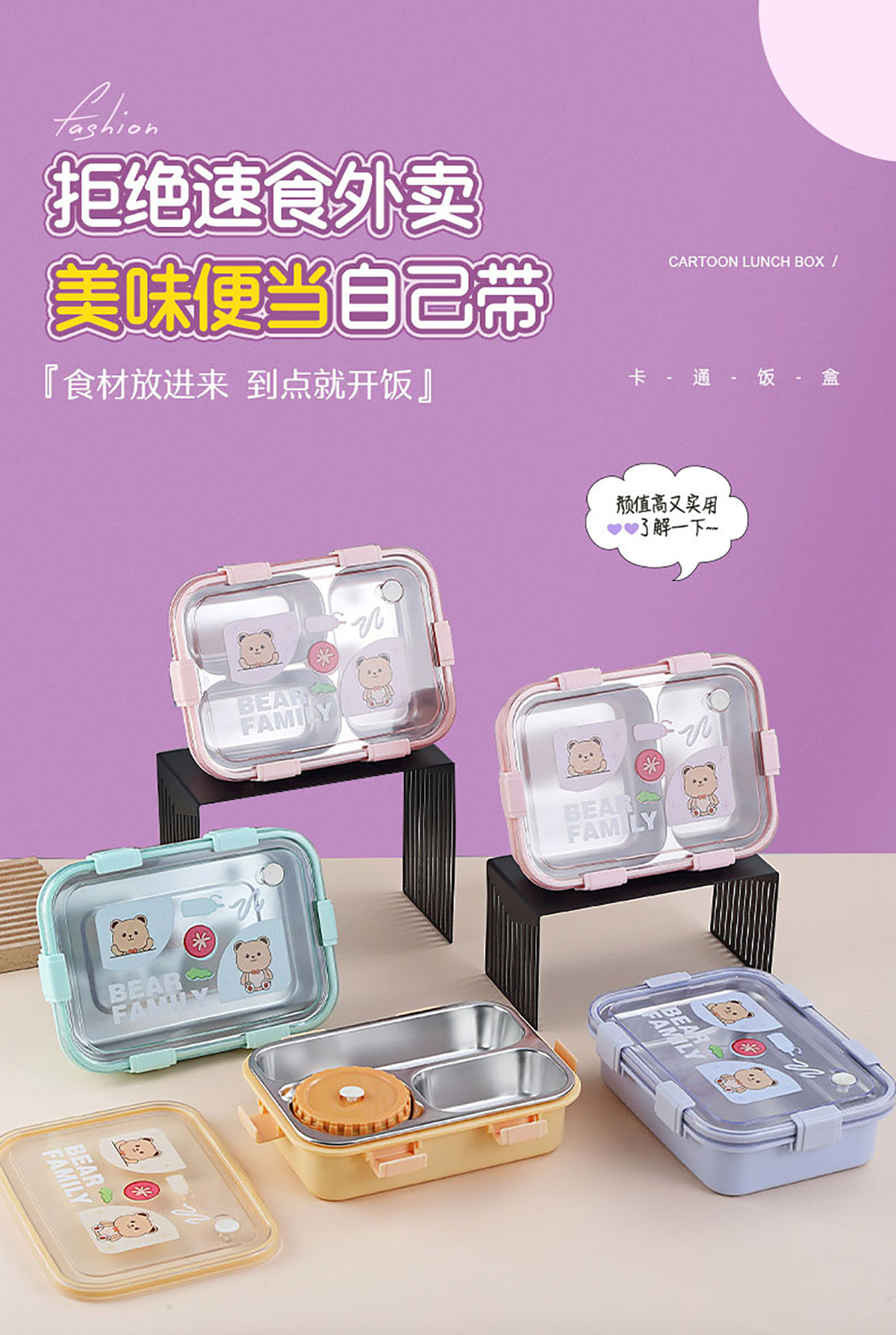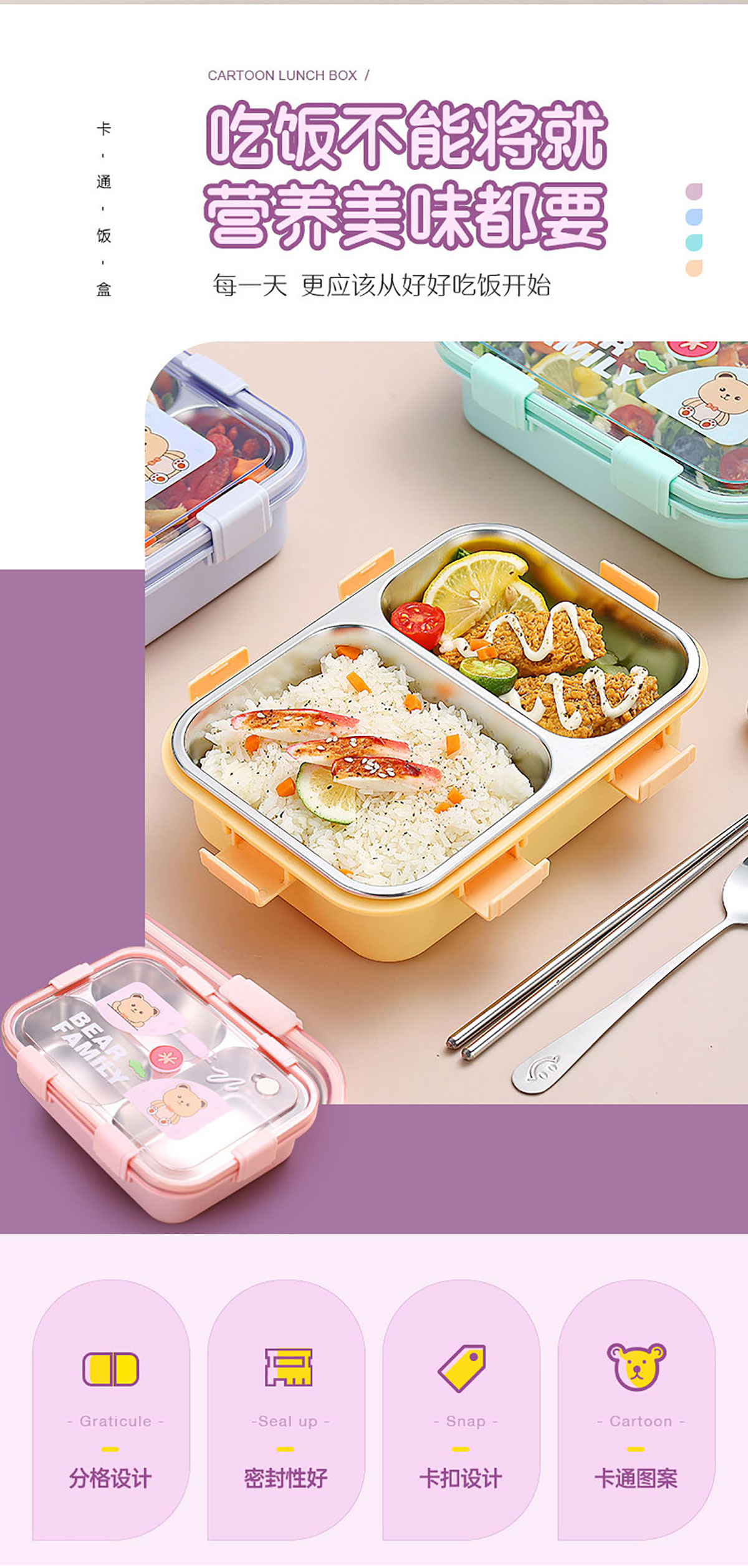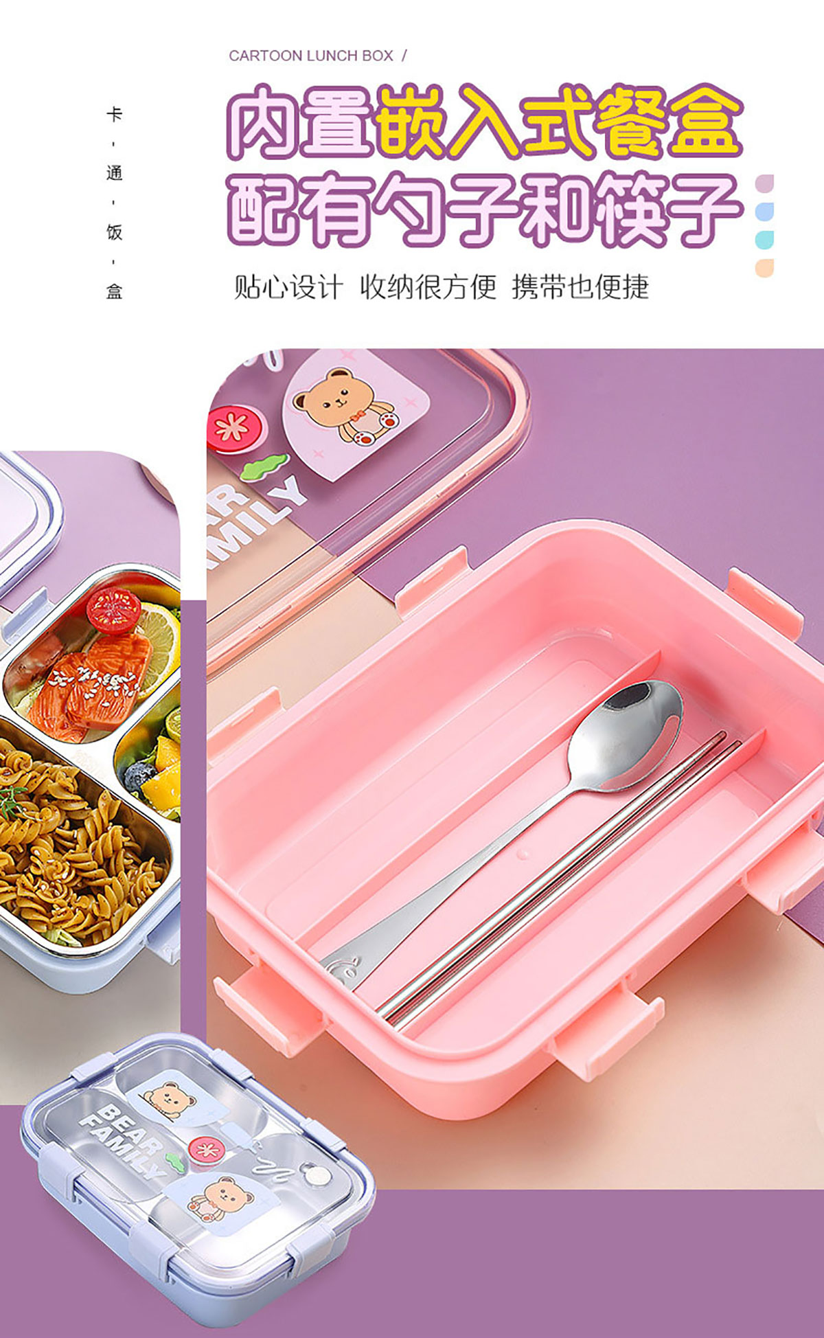 卡通小熊304不銹鋼飯盒(一格 850ml/二格800ml/三格750ml/三格+碗700ml+150ml)
