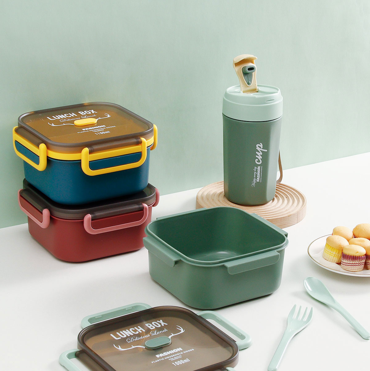 正方雙層/單層密封飯盒+圓形/八角隨行杯