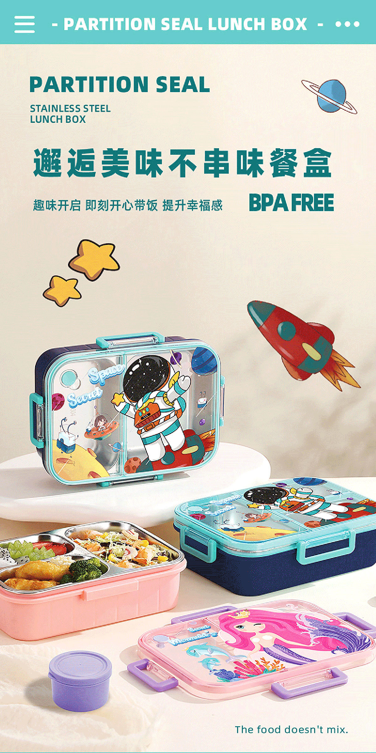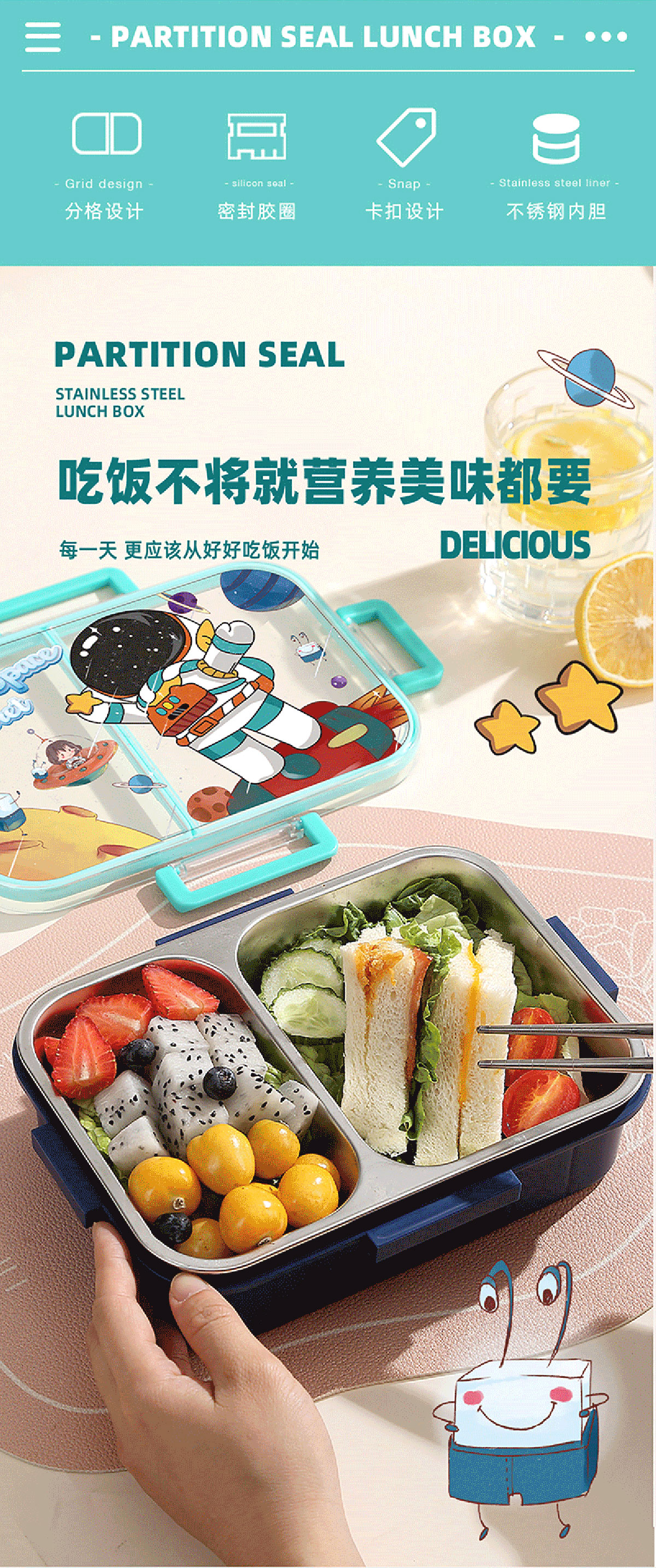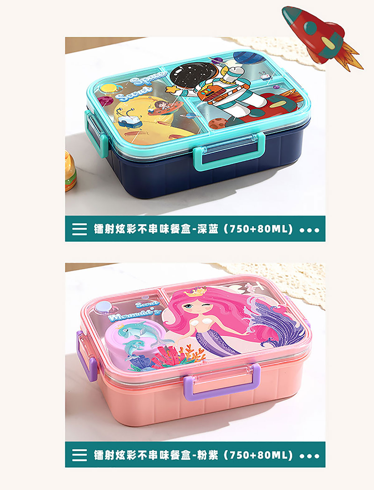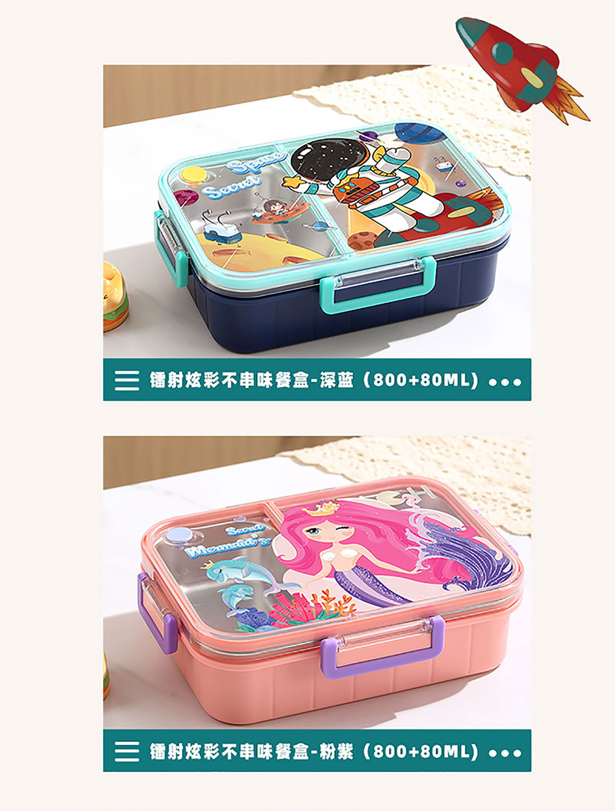 彩光卡通不串味餐盒(不銹鋼2格800ml/3格750ml+醬料杯80ml)